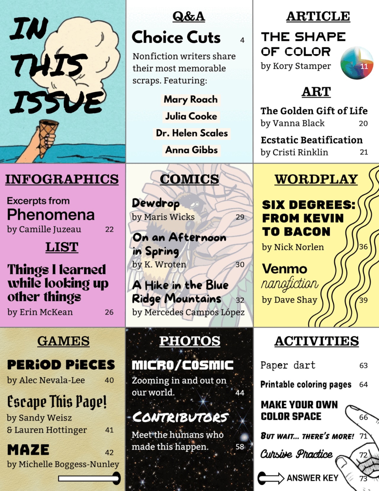 And in his magazine, which he launched on June 24, Norlen gives us 70 more pages of writing, art, comics, infographics, photography, games, activities, and yes, more wordplay—all as contributed by top talent, from bestselling author Mary Roach to New Yorker-published illustrator K. Wroten.