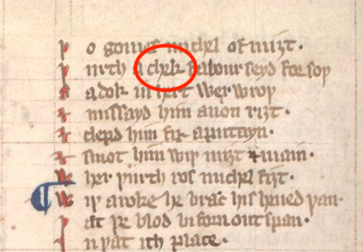 English captured the singular eschec in the form of chek by 1330. Here, it appears in the Auchinleck Manuscript, an invaluable illuminated manuscript comprising lives of saints, medieval romances, religious verse, and more.